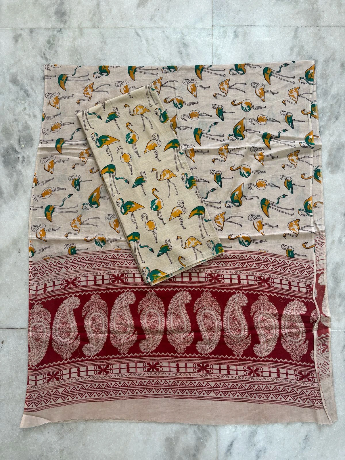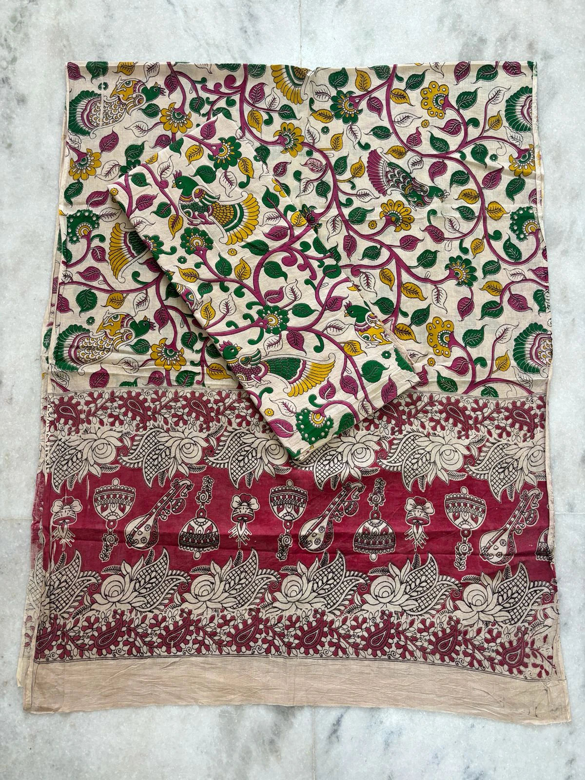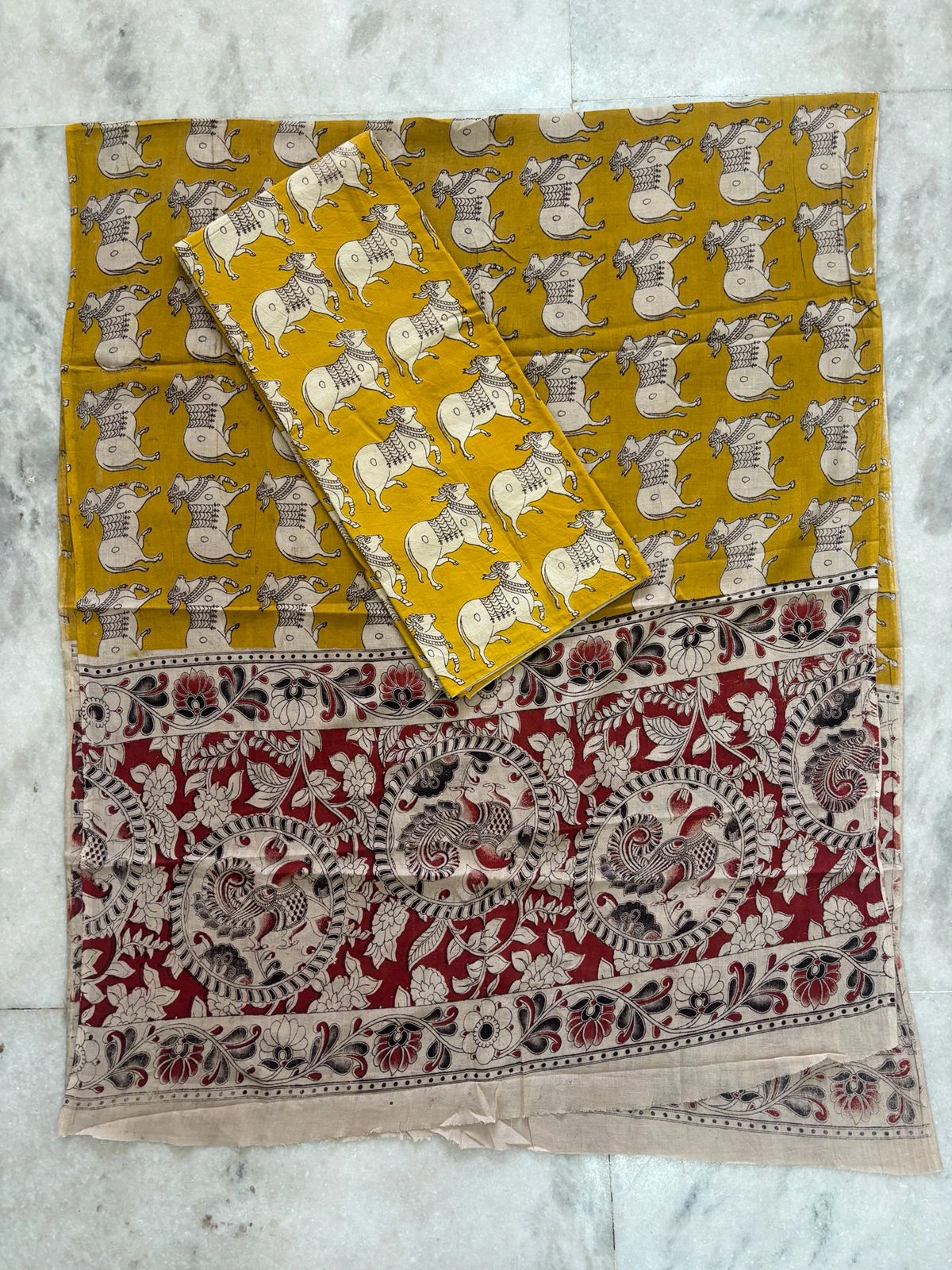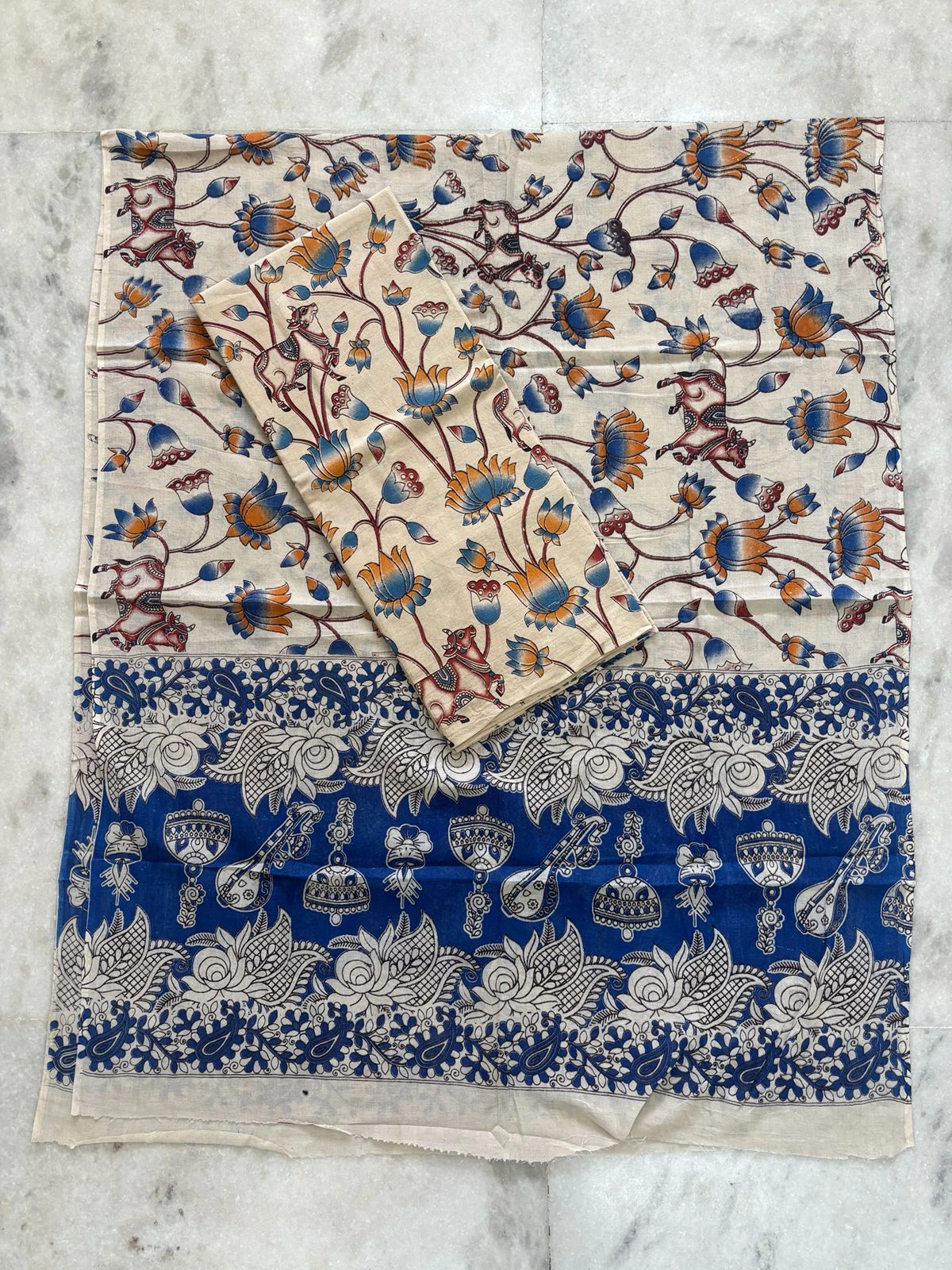 " Pure Kalamkari dress materials featuring rich prints, breathable fabric, and timeless handcrafted elegance".