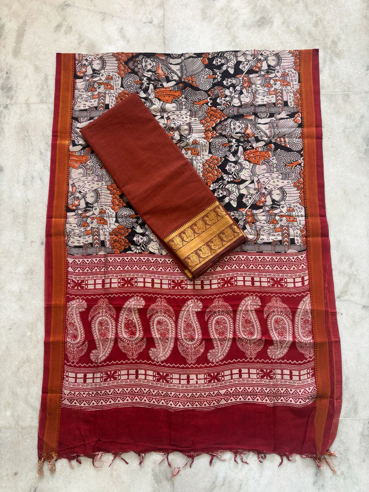“Handloom Mangalagiri top featuring a rich Kanchi border, beautifully paired with a Chennuri silk dupatta.”
